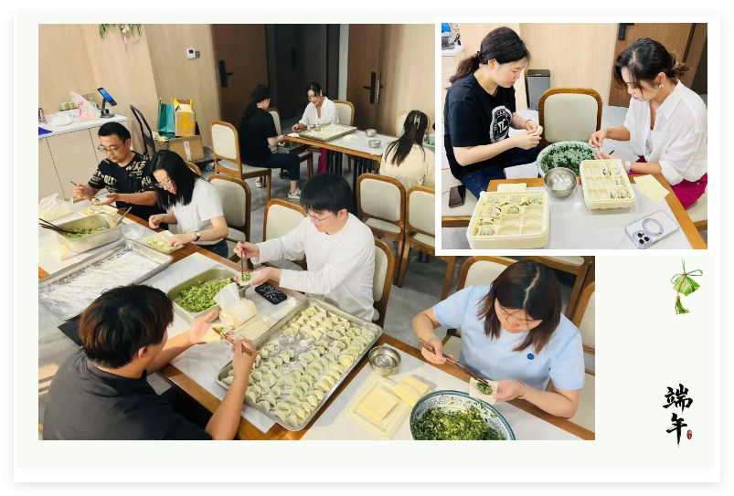十余名员工围聚长桌巧制佳节美味:青翠粽叶裹入软糯香甜,南北手法碰撞出四角粽与元宝饺;面皮翻飞间,有传统技艺,也有创意饺。指尖沾着糯米与面粉。欢笑声中,民俗文化化作职场烟火,焕发着鲜活生气 。